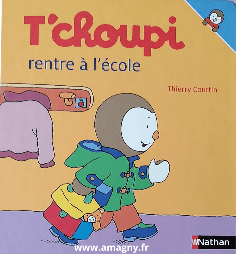 - T’choupi rentre à l’école de Thierry Courtin, édition Nathan (1998). Je ne suis pas hyper fan de T’choupie mais disons que c’est un classique.