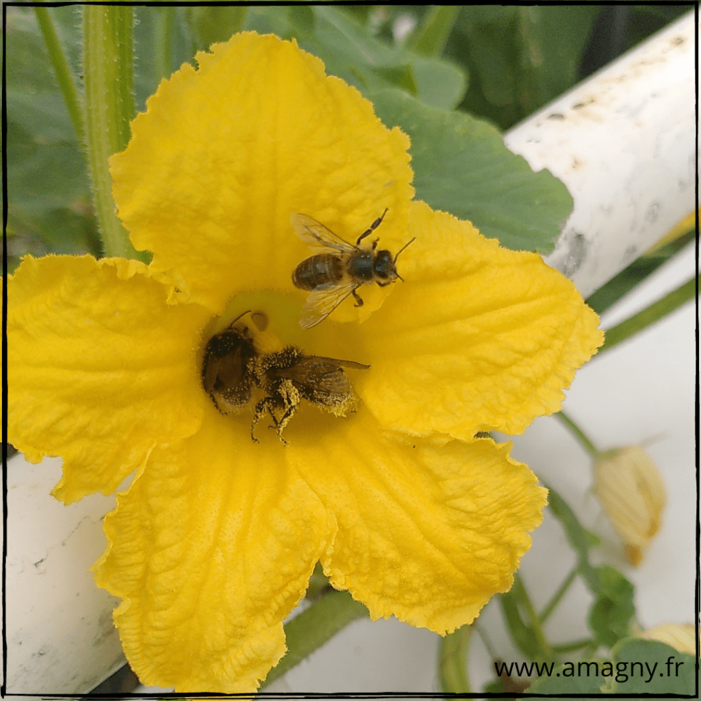 Je ne suis pas peu fière d’annoncer qu’en juillet, ma terrasse est devenue une véritable oasis pour les insectes. Les fleurs de courgettes et de potimarrons étant particulièrement abondantes, les abeilles et autres bourdons se relaient du matin en soir dans ce que je qualifierai d’orgie de pollen!