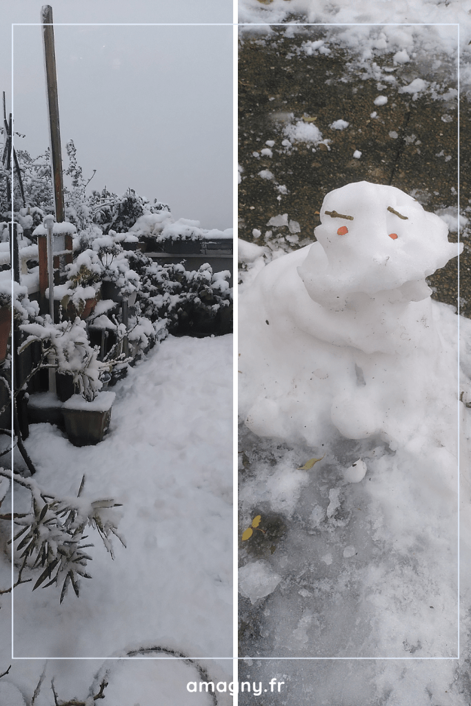 Nous avons réalisé un petit bonhomme de neige. Cela m’a remémoré les différents épisodes neigeux rocambolesques que j’ai vécus et surtout mon tout premier bonhomme. Je me rappelle qu’enfant j’étais un peu mélancolique en le voyant fondre. C’est toute la beauté du côté éphémère de la neige. Quel enfant ne rêverait pas d’avoir un petit Olaf qui ne fond jamais ?